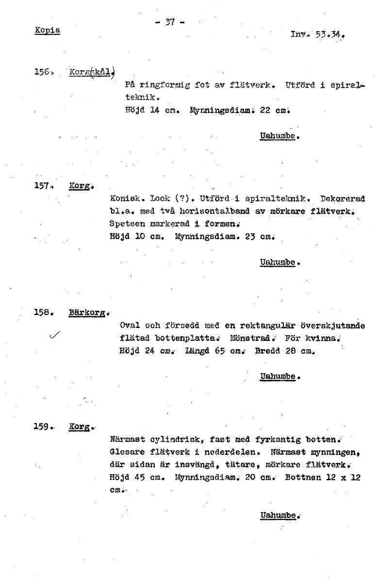 Kopia ikr:. 53434 156,p .k2.11E-002.1 På ringformig fot av flätverk. Utförd i egral-- teknik. Höjd 14 cm. Mynningsdiami; 22 cm. Uahumbe. 1574 MES* Konisk. Lock (?). Utförd -i spiralteknik. DekOrerad bl.a. med två horisontalband av mörkare flätverk. Spetsen markerad i formen, Höjd 10 cm. Mynningsdiam. 23 cm. Uåhumbe. 158. Bärkug. Oval och försedd med en rektangulär överskjutande u/ flätad bottenplatta. Mönstrad. Pör kvinna, Höjd 24 om. Längd 65 om ; Bredd 28 om. Uahumbe. 159 Luis. „ Närmast cylindriek9 fast med fyrkantig botten. Glesare flätverk i nederdelens Närmast mynningen, där sidan är insvängd, tätare, mörkare flätverk. Höjd 45 cm. Mynningsdiam. 20 cm. Bottnen 12 x 12 cm., Uahumbe, [ocr]