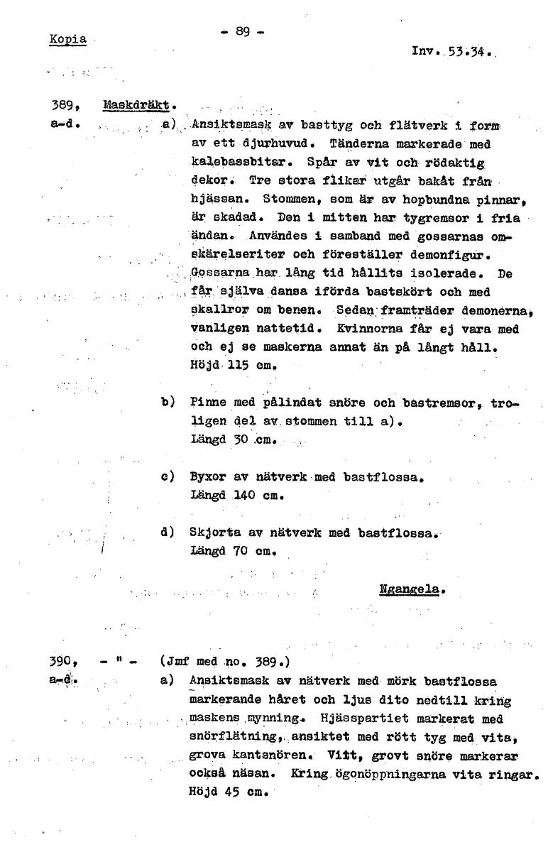 Kopia Iwrb 53.34. 389, Maskdräkt. a):Ansiktsmask av basttyg och flätverk i form av ett djurhuvud. Tänderna markerade med kalebassbitar. Spår av vit och rödaktig dekor,: Tre stora flika utgår bakåt från hjässan. Stommen, som är av hopbundna pinnar, är skadad. Den i mitten har tygremsor i fria ändan. Användes i samband med gossarnas om- skärelseriter och föreställer demonfigur. Gosearna.har läng tid hållits isolerade. De sjgva dansa iförda bastskört och med skallror om benen. Sedan' framträder demonerna, vanligen nattetid* Kvinnorna får ej vara med och ej se maskerna annat än på långt håll. Höjd, 115 om. b) Pinne med pålindat snöre och bastremsor, tro. ligan del av, stommen till a). Längd 30 .cm. c) Byxor av nätverk med bastflossa. Länd .l40 cm. d) Skjorta av nätverk med bastflossa.- längd 70 em, ngangela. 390, (Julf med To. 389.) -'48 a) Ansiktsmask av nätverk med mörk bastflossa markerande håret och ljus dito nedtill kring , maskens mynning4 Hjäsepartiet markerat med snörflätning,, ansiktet med rött tyg med vita, grova kantsnören. Vitt, grovt snöre markerar också näsan. Kring,ögonöppningarna vita ringar. Böjd 45 cm. [ocr]