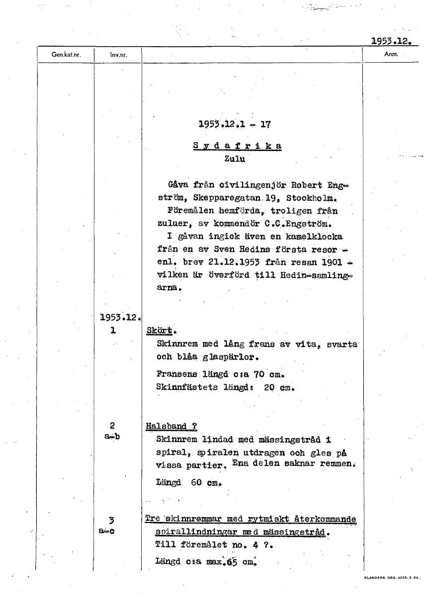• 1953.12. 1.7 Sydafrika Zulu Gåva från civilingenjör Robert Eng. ström, Skepparegatan. 19, Stockholm. Föremålen hemförda, troligen från zaluer9, av kommendör C.C..Engström. I 4:van ingick även en kamel... Visa hela