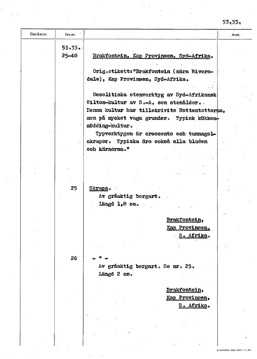 53 53.33., 25-48 Draltein Ka do.Af karl Origootikett:"Drakfontein (nära Rivere- dala), Kap Provineen, S d«Afrik Mesolitieka stenverktyg av Syd-Afrikansk Wilton-kultur av S...Ao sen etenäldero, Denna kultur har tillekrivite Hottentott° men på mycket vaga grunder° Typisk kökke ffidding-kultur. Typverktygen är creecente och tumnageli• skrapor* Typiska äro också alla bladen och kärnorna' 25 Skrapa Av gråaktig bergart. Längd 1,8 cm. Brekfontein, Jap Provinsen. S Afrika 26 Av gråaktig bergart° Se nr. 25 Längd 2 cm, Brakfonteln, Le121911122n, Sc Afrika. [ocr]