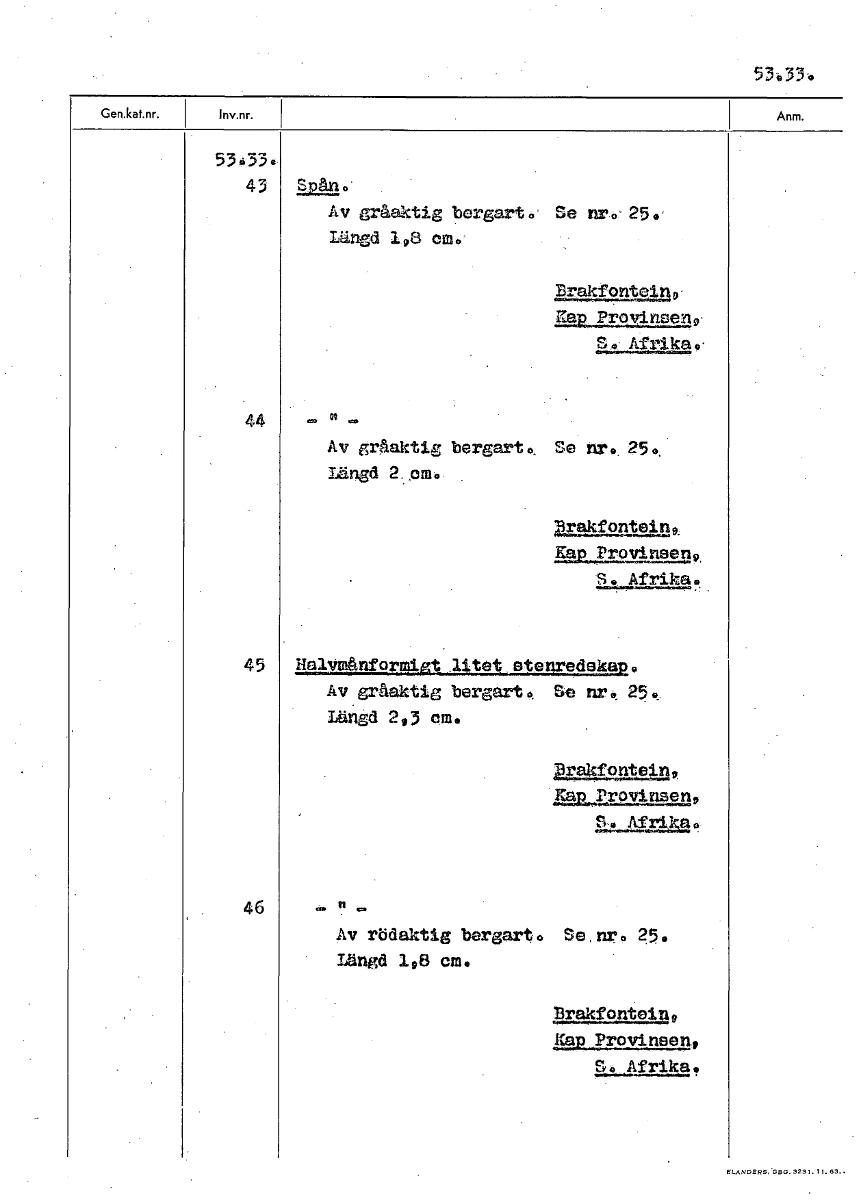 • 534334 53.33. 43 SiAn. Av gråaktig bergart. Se nr.' 25. Längd 1,8 cm.- Brakfonk2a9 gRAtERYAnätn9' S. Afrika.. 44 Av gråaktig bergart., Se nr. 250, Längd 2.9m. Brakfontein9 ILTMADRE39 %. Afrika. 45 Hal... Visa hela