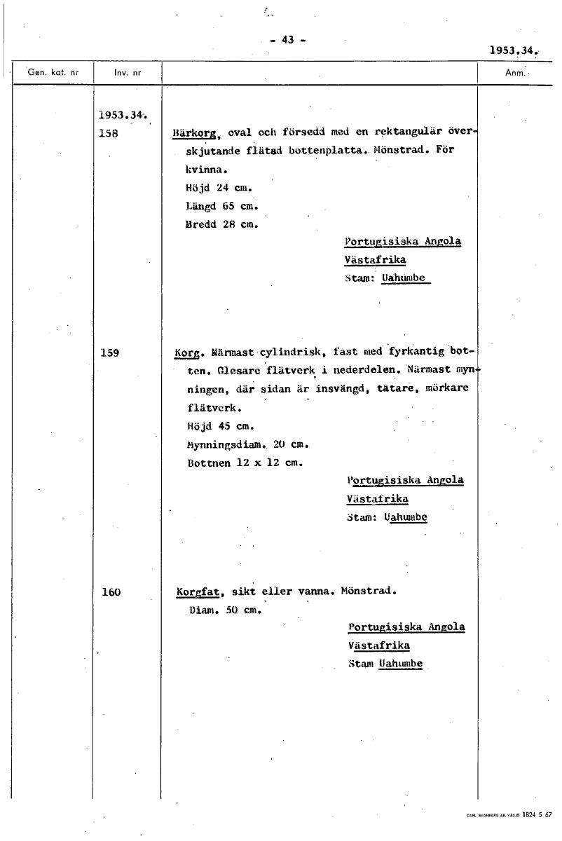 -43- 1953.34: 1953.34.. 158 sirhom, oval och försedd med en rektangulär över skjutande flätad bottenplatta. Mönstrad. För kvinna. Höjd 24 cm. Längd 65 cm. Bredd 28 cm. Portugisiaka. Angola Västafrika Stam: Uahuinbe 159 1.5213. Närmast cylindrisk, fast med fyrkantig bot- ten. Glesare flätverk i nederdelen. Närmast myn ningen, där sidan är, insvängd, tätare, mörkare flätverk. Höjd 45 cm. Mynningsdian. 20 cm. Bottnen 12 x 12 cm. Portugisiska Angola Västafrika Stam: Uahumbe 160 Korgfat, sikt eller vanna. Mönstrad. Diam. 50 cm. Portugisiska Angola Västafrika Stam Uahumbe [ocr]Stäng