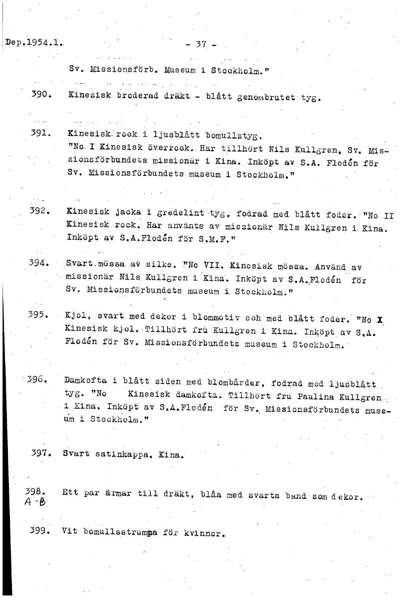 - 37 - Sv. Missionsförb. Museum i Stockholm." 390. Kinesisk broderad dräkt- blått genombrutet tyg. 391. Kinesisk.rock_i ljusblått bomullstyg: "No.I_Kinesisk överrock, Har tillhört Nils Kullgren, Sv. '...