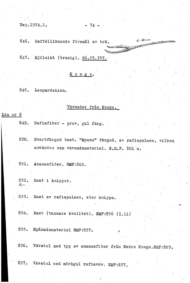 .Dep.1954.1. - 74. - 846. Gaffelliknande föremål av trä. 847. Mjölsikt (trasig). 06.25.357. Kong o. 848. Leopardskinn. Vävnader från Kongo. Lda nr 8 849. Rafiafiber - prov, gul färg. 850. Svartfärgad bast. "Mpusun färgad, av rafiapalmen, vilken användes som vävnadsmaterial. S.M.F. 801 a. 851. Ananasfiber. SMF:802. 852. Bast i knippor. 853. Bast av rafiapalmen, stor knippa. 854. Bast (tunnare kvalitet). SMF:856 (1.11) 855. Spånadsmaterial SMF:857. 856. Vävstol med tyg av ananasfiber från Nedre Kongo.SMF:803. 857. Vävstol med mörkgul rafiaväv. Sie.?:8 7. [ocr]Stäng