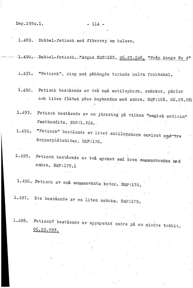 • Dep.1954.1. - 114 - 1.489. Dubbel-fetisch med .fiberrep om halsen. __________i_j_490„---Dubbel-fetis_oh„21Avgud SEP:185. '6.25.248._"Från Kongo No 4" 1.491. "Fetisch", ring, med .påhängda torkade halv... Visa hela