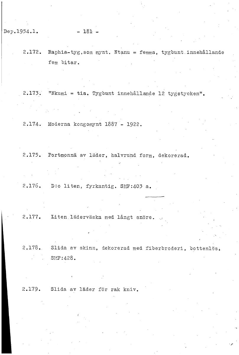 Dep.1954.1. - 181 - 2.172. Raphia-tyg,som mynt. Ntanu = femma, tygbunt.innthållande fem bitar. 2.173: "Nkumi = tia. Tygbunt innehållande 12 tygstyoken". 2.174. Moderna kongomynt 1887 - 1922. 2.175. Portmonnä av läder, halvrund form, dekorerad. 2.176. D:o liten, fyrkantig. SMP:405 a. 2.177. Liten.läderväska med långt snöre. 2.178.. Slida av skinn, dekorerad med fiberbroderi, bottenlös: S1.111:428. 2.179. Slida av läder för rak kniv. [ocr]
