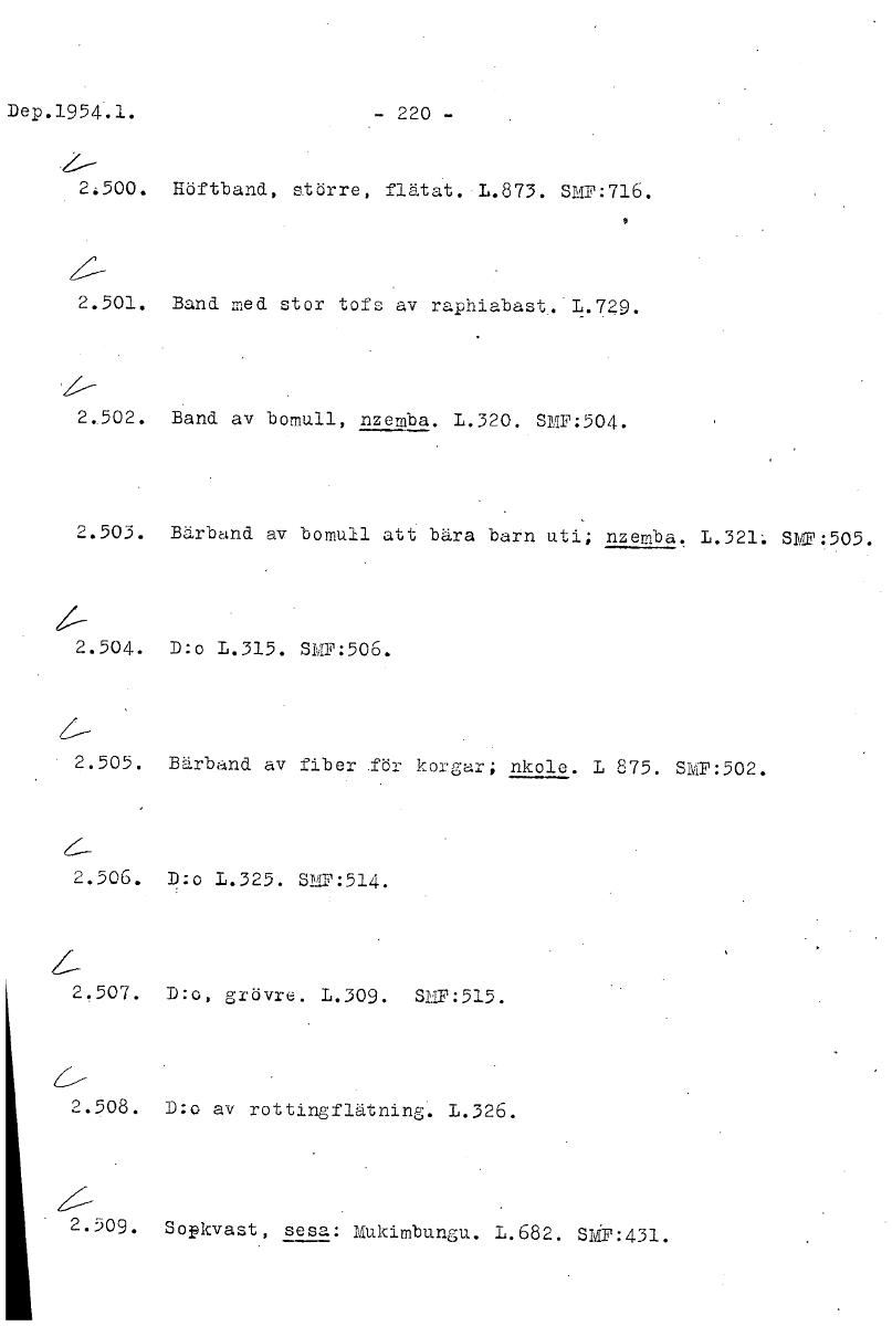 Dep.1954.1. - 220 - 2.500. Höftband, större, flätat. L.873. SMF:716. 2.501. Band med stor tofs av raphiabast..L.7 9. 'G/- 2.502. Band av bomull, nzemba. L.320. SMF:504. 2.503. Bärband av bomull att bära barn uti; nzemba. 1.321: SMF:505. 2.504. D:o 1.315. SMF:506. • 2.505. Bärband av fiber. för korgar; nkole. 1 875. SMF:502. 2.506. D:o 1.325. SMF:514. 2.507. D:o, grövre. L.309. SHF:515. 2.508. D:o av rottingflätning. 1.326. 2.509. Sopkvast, sesa: Mukimbungu. 1.682. SMF:431. [ocr]Stäng