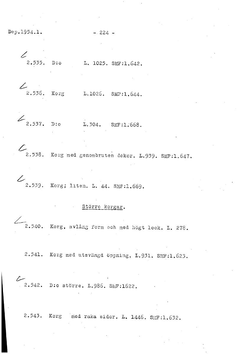 • Dep.1954.1. - 224 2.535. D:o L. 1025. SMF:1.642. 2.536. Korg 1.1026. SMP:1,644. 2:-12.537. D:o 1.304. SMF:1:668. 2.538. Korg 'med genombruten dekor. L.939. SMF:1.647. 2.539. Korg; liten. L. 44. SMF:1.... Visa hela