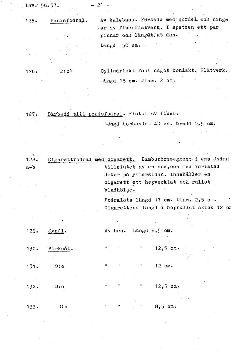 Inv. 56.37. 21 - 125. Penisfodral. Av kalebass rsed• mcd'gördeL och, ringei ar av fiberflätverk. I sp6tSen ett par pinnar och längåt:ut dun. Längd ,50 cm. 126. D:o? Cylindriskt fast något koniskt. Flätverk.. Längd 18 cm. Diam. 2 cm. 127. Bärband till penisfodral. Flätat av fiber. Längd hopbundet 40 cm. bredd 0,5 cm. Cigarettfodral med cigarett'. Bamburöräsegment, i .ria ändan a-b tillslutet av en nod,och med inristad dekor på yttersidan. Innehåller 'en cigarett ett hopvecklat och rullat' bladhölje. Fodralets längd 17 cm. Diam. 2,5 cm. Cigarettens längd i hoprullat skick 12 cr 129. ,Id111. Av ben. Längd 8,5 cm. 130. VirknÅl. 12,5 cm. 131. D:o 12 em. 132. D:o 12,5 cm. 133. D:o 8'95 cm. [ocr]