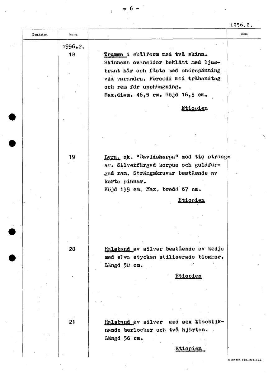 1956.2. • 1956.2. 18 Trumma i skålform med två skinn. Skinnens ovansidor beklätt med ljus- brunt hår och fästa med snörspänning vid varandra. Pörsedd med trähandtag och rem för upphängning. Max.diam. 46,5 cm. Höjd 16,5 cm. Etipoien 19 14kra. sjc, nhvidsharpa" med tio sträng ar. Silverfärd korpus och guldfär- gad ram. Strängskruvar bestående av korts pinnar. Höjd 135 em. Max, bredd 67 cm. Etionien 20 Halsband av silver bestående av kedja med elva stycken stiliserade blommor. Längd 50 cm. Etiopien 21 Halsbnnd av silver med sex klooklik- Ilande berlocker och två hjärtan. , Längd 56 cm. Etiopien [ocr]Stäng