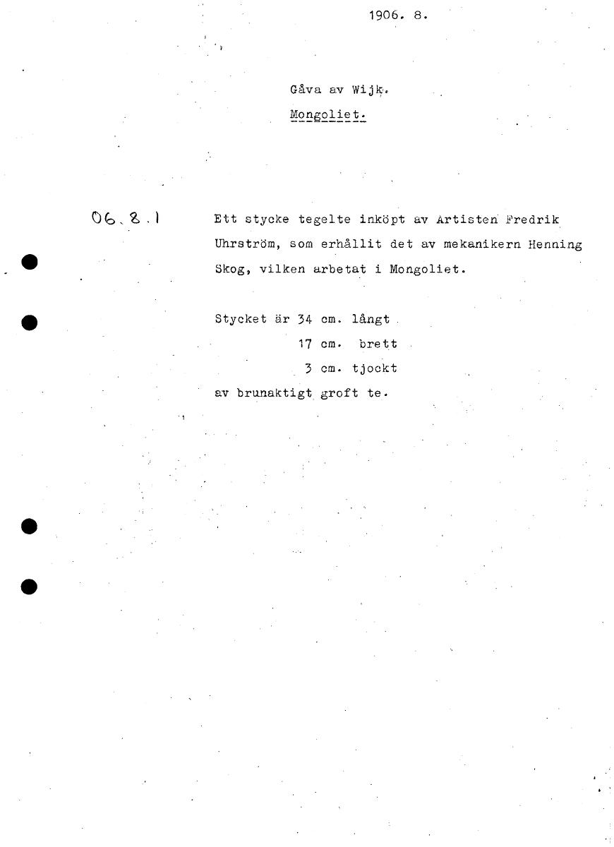 • Gåva av wijg, Monuliet. Ett stycke tegelte inköpt av Artisten Fredrik Uhrström, som erhållit det av mekanikern Henning • Skog, vilken arbetat i Mongoliet. • Stycket är 34 em. långt 17 cm. brett 3 cm. ... Visa hela