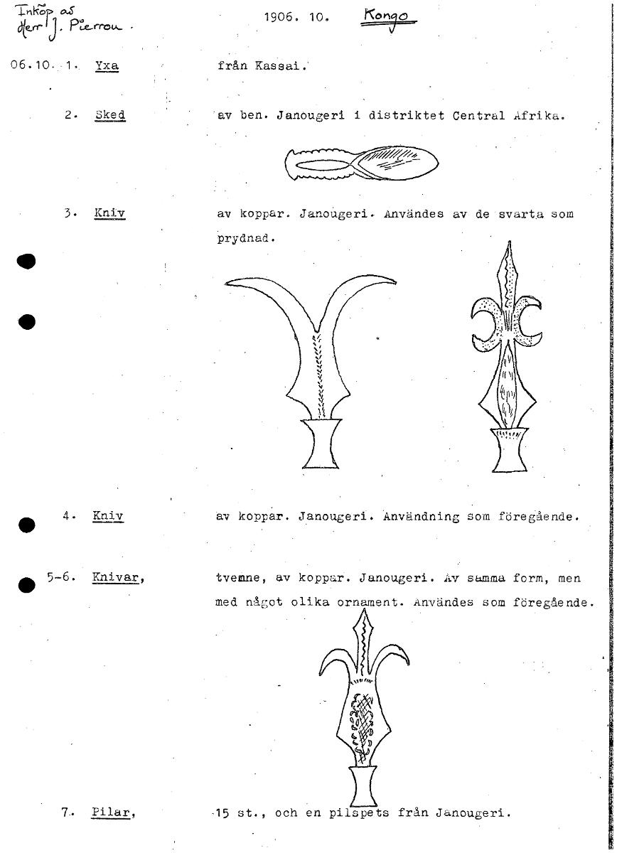 • 1;111;4› aS 1906. 10. ki 3 , Ke-rrol.A... 06,10. Yxa från Kassai. 2. Sked av ben. Janougeri i distriktet Central Afrika, 3. Kniv av koppar. Janoågeri. Användes av de svarta som prydnad. 4. Kniv av kop... Visa hela