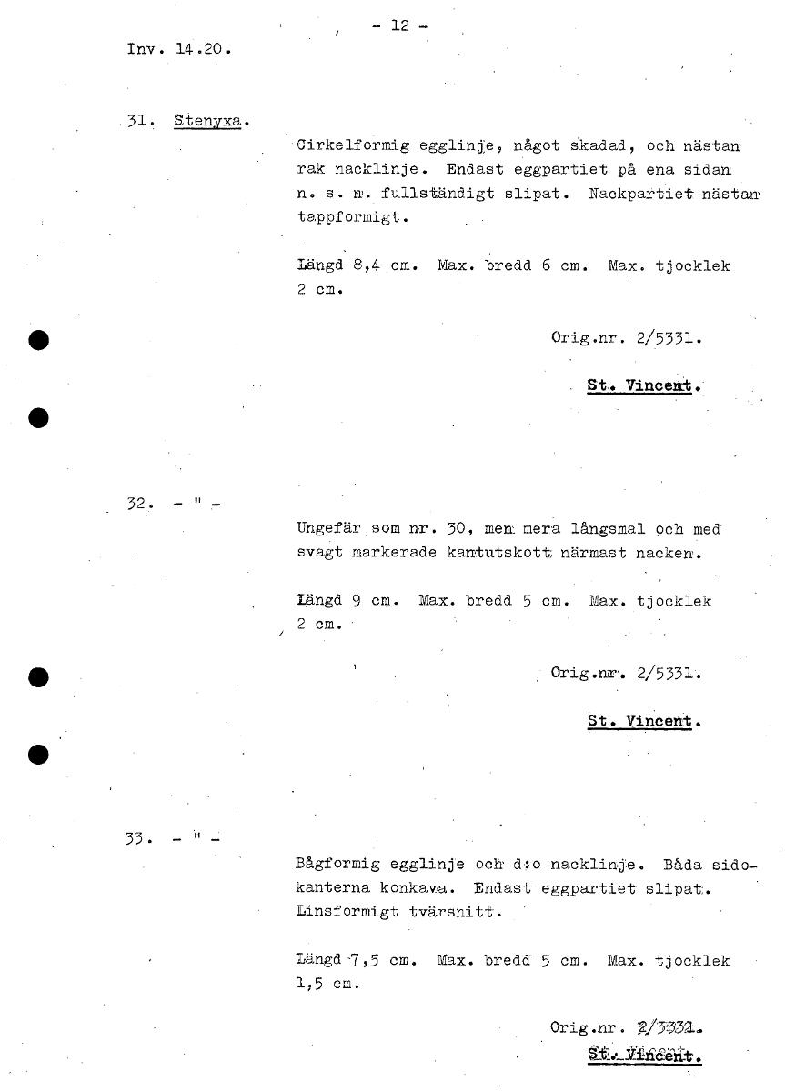 - 12- Inv. . 14.20 . 31. Stenyxa. Cirkelformig egglinje, något skadad, och nästan rak nacklinje. Endast eggpartiet på ena sidan n. s. n. fullständigt slipat. Nackpartiet nästan tappformigt. Längd 8,4 cm. Max. bredd 6 cm. Max. tjocklek 2 cm. Orig .nr . 2/5331. St. Vincent. 32. Ungefär. som nr. 30, men mera långsmal och med svagt markerade kantutskott närmast nacken. Längd 9 cm. Max. bredd 5 cm. Max. tjocklek 2 cm. • Orig.nr. 2/5331. St. Vincent. 33. - " - Bågformig egglinje och d.-;,o nacklinje. Båda sido- kanterna konkava. Endast eggpartiet slipat. Iinsformigt tvärsnitt. längd 7,5 cm. Max. bredd 5 cm. Max. tjocklek 1,5 cm. Orig.nr. g/5332.. [ocr]