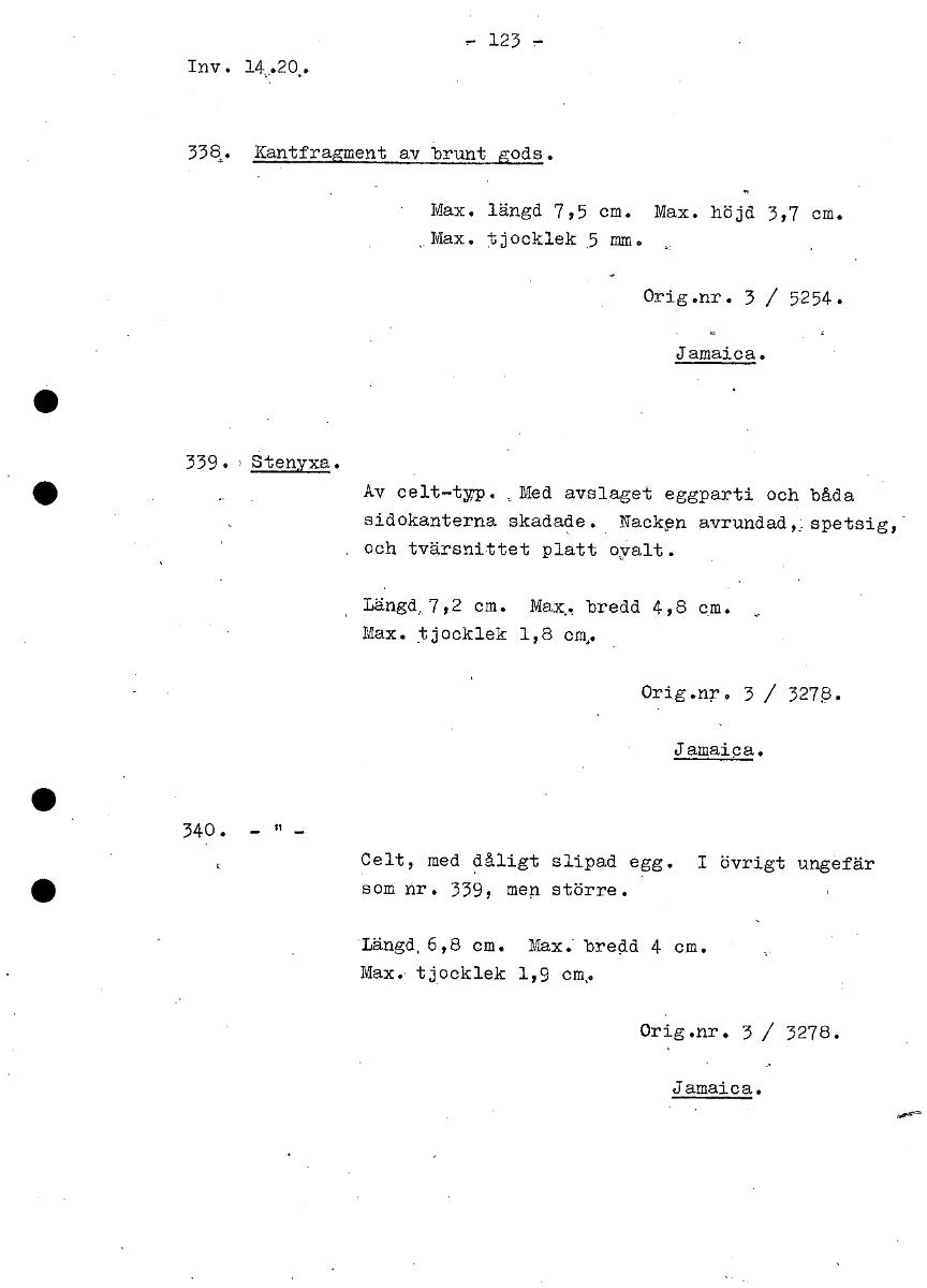 • 123 Inv. 338. Kantfragment av brunt gods. Max. längd 7,5 cm. Max. höjd 3,7 cm. Max. tjocklek 5 mm. Orig.nr. 3 / 5254. Jamaica. 339. Stenyxa. Av celt-typ. ,lted avslaget eggparti och båda sidokanterna ... Visa hela