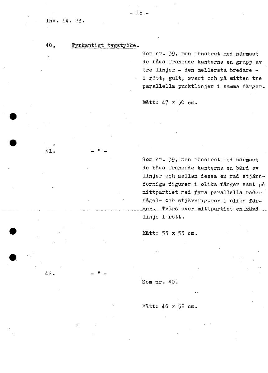 - 15 - Inv. 14. 23. 40, Fyrkantigt tygstycke. Som nr. 39, men mönstrat med närmast de båda fransade kanterna en grupp av tre linjer - den mellersta bredare - i rött, gult, svart och på mitten tre para...