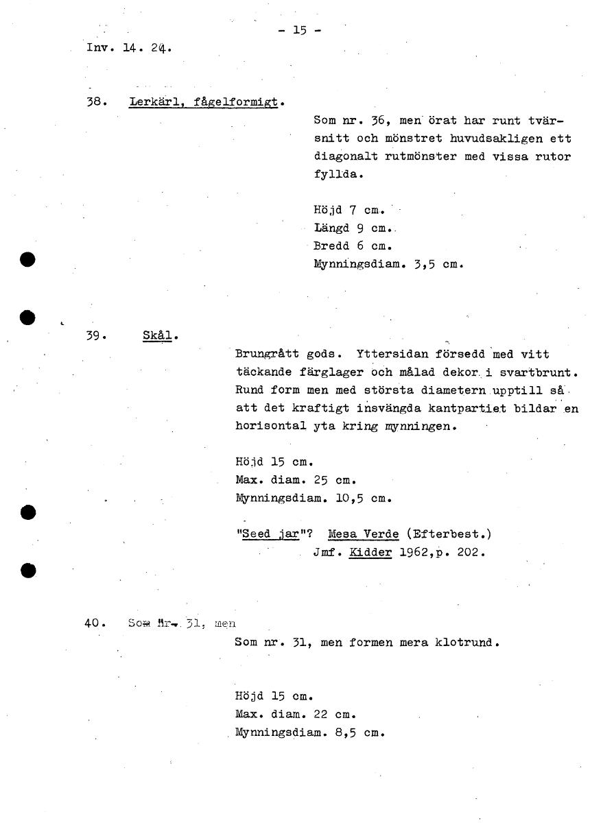 - 15 - Inv. 14. 24. 38. Lerkärl, fågelformigt. Som nr. 36, men örat har runt tvär- snitt och mönstret huvudsakligen ett diagonalt rutmönster med vissa rutor fyllda. Höjd 7 cm. Längd 9 cm. Bredd 6 cm. ...