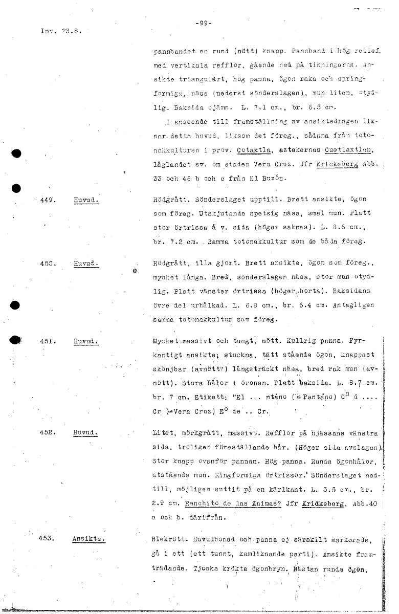 -99- In-. n3.8. pannbandet en rund (nött) knapp. Pannband i hög relief, med vertikala refflor, gående ned på tinnirv.,arna. An- sikt triangulärt, hög Panna, ögon raka och spring- formic, näsa. (nederst sönderslagen), mun liten, otyd- lig. Baksida ojämn. L. 7.1 cm., br. 6.5 em. .1 anseende till framställning. av ansiktsdragen lik- narsdetta huvud, liksom det föreg., sådana fr7i.n toto- . nakkulturen i •prov. Cotaxtla, aztekernas Cuetlaxtlan, låglandet sv. om staden Vera Cruz. Jfr Krickeberg Abb. 33 och 46 b och c frAn El BUz6n. • Huvud. Rödgrått. Sönderslaget upptill. Br tt ansikte, ögon som föreg. Utskju gnde spetsig /låsa, smal mun. Platt stor örtrissa å v. sida (höger saknau). L. 8.6 cm., br. 7.2 cm. 3amma totonakkultur som de båda föreg. Huvud. Hödgrått, illa gjort. Brett ansikte, ögon som föreg., mycket långa. Bred, sönderslagen näsa. stor mun otyd- lig. Platt vänster örtrissa (hoger,borta). Baksidans 41› övre del urhålkad. L. .8 cm., br. 6.4 cm. Antagli,zen samma totonakkultur som föreg. lek 451, Huvud. Mycket,massivt och tungt, nött. Kullrig panna. Fyr- kantigt ansikte; stuckna, tått stående ögdn, knappast skönjbar (avnött?) långsträckt näsa, bred rak munlav- nött). åtora hålor i öronen.,Platt.bak.-.sida. L. 8.7 cm. hr. 7 cm. Etikett: "El .,. ntgino ('‘Panta:po) Cr' d .... Cr. Cruz E° de .. Cr. Huvud. Litet, mörZgrätt, massivt. Refflor på hjässans vanstra sida, troligen föreställande hår. (Höger sida avslagen Stor knapp ovanför pannan. Hög panna. Runda ö2onhålor, utstående mun. Ringformiga örtrissor: Jönderslaget ned- . till, möjlip-en suttit pgi en kärlkant. L. 3.5 cm., br. 2.9 cm. Ran„,,'to de las mas? Jfr 4ridkeberg, Abb.40 a och b. därifrån. 453. ikte. . Blekrött. Huvudbonad och,panna ejsärskilt markerade, gå i ett (ett tunnt, kamliknande parti). Ansikte fram- trädande. Tjocka krökta Ögonbryn. Ååstan runda kim, \ [ocr]