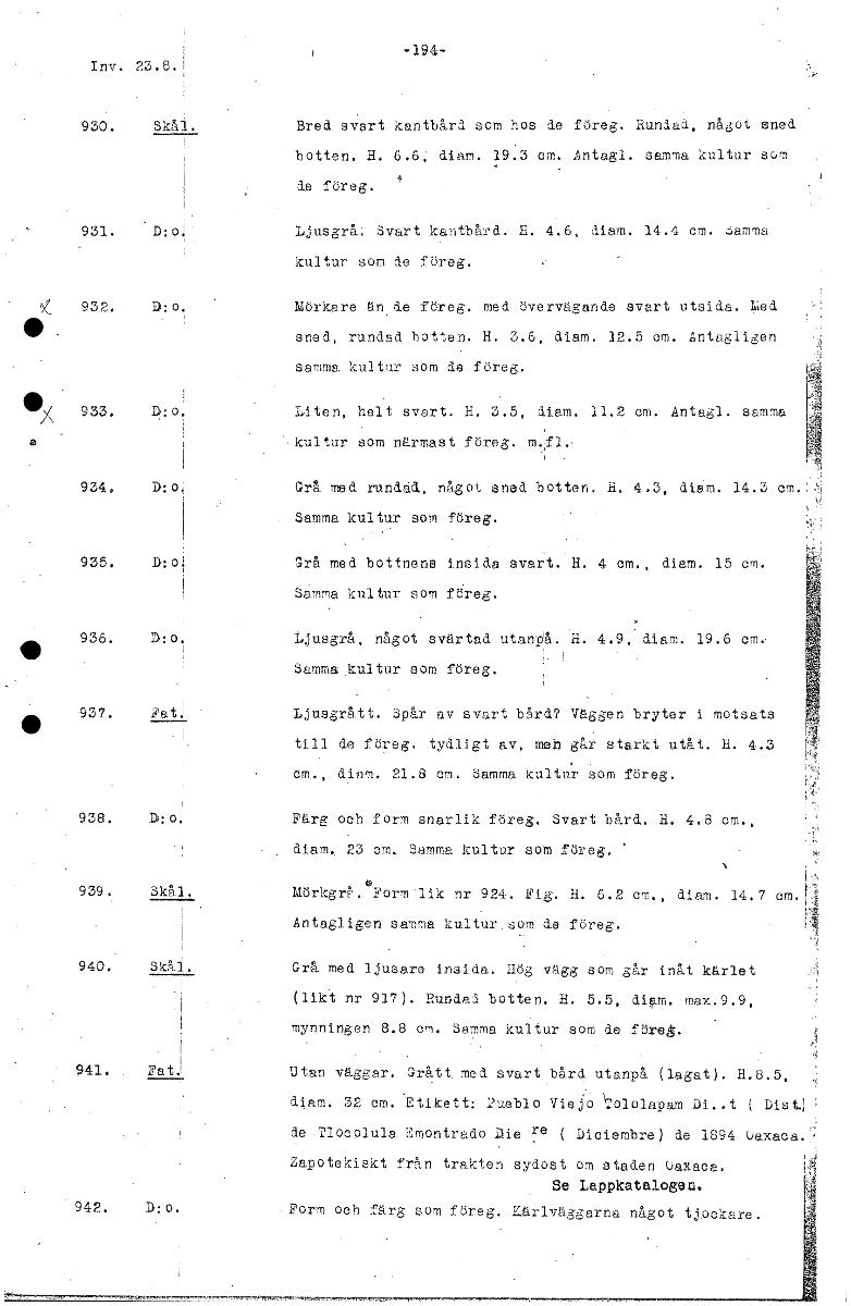 -194- Inv. 23.8. Skål. Bred svart kantbård som hos- de föreg. Rundad, något sned botten. H. 6.6; diam. 19.3 cm. Antagl. samma kultur som de föreg. D:o. Ljusgrå: Svart kantbård. H. 4.6, diam. 14.4 cm. ...