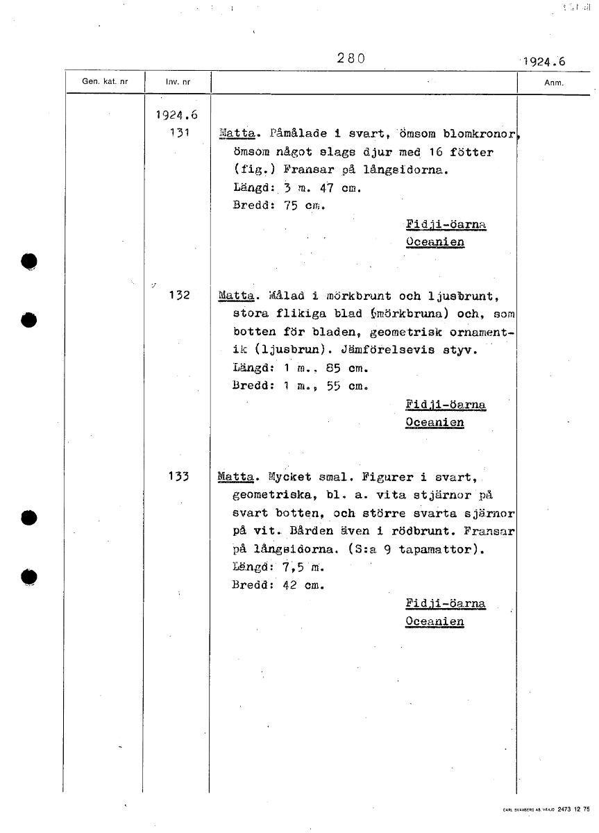 280 1924.6 1924.6 131 Matta. Påmålade i svart, ömsom blomkronor ömsom något slags djur med 16 fötter (fig.) Fransar på långsidorna. Längd: 3 m. 47 cm. Bredd: 75 cm. •-öarnk Oceanien 132 Matta. Målad i...