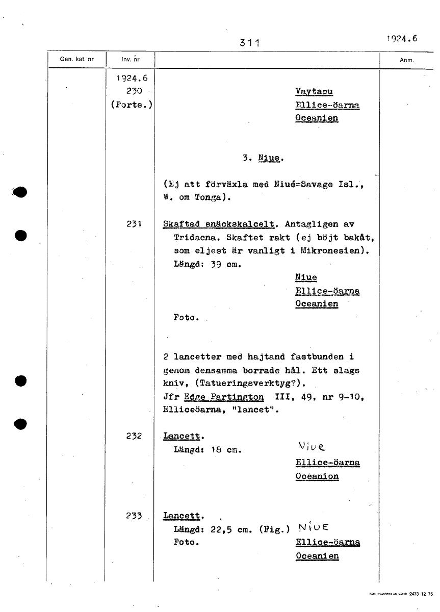 311 1924.6 1924.6 230 IrRyta222 (Forts.) Ellice-öarna Oceanien 3. Niue. (Ej att förväxla med Niu4=Savage Isi., W. om Tonga). 231 Skaftad snäckskalcelt. Antagligen av Tridacna. Skaftet rakt (ej böjt ba...