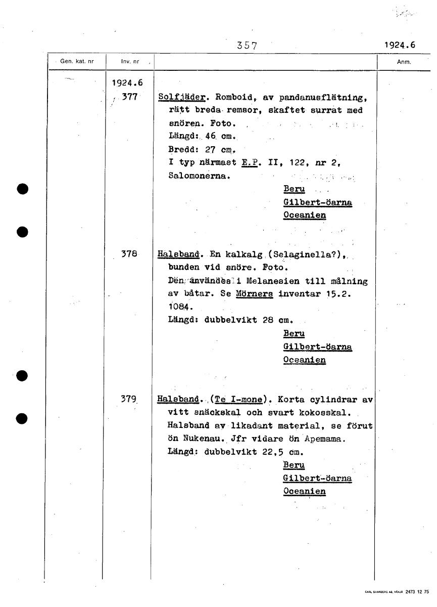 35 7 1924.6 1924.6 377 Solfjäder. Romboid, av pandanusflätning, rätt breda, remsor, skaftet surrat med snören. Foto. Längd: 46 cm. Bredd: 27 cm. typ närmast E.P. II, 122, nr 2, Salomonerna. Beru Gilbert-öarna Oceanien 378 Halsband. En kalkalgASslaginella?), bunden vid snöre. Foto. Den;'änvändesli Melanesien till målning av båtar. Se Mörners inventar 15.2. 1084. Längd: dubbelvikt 28 cm. Beru Gilbert-öarna Oceanien 379. Halsband. (Te I,-mone).Korta cylindrar av vitt snäckskal och svart kokosskal. Halsband ay likadant material, se förut ön Nukenau.. Jfr vidare ön Apemama. Längd; dubbelvikt 22,5 em. Beru Gilbert-öarna Oceanien [ocr]