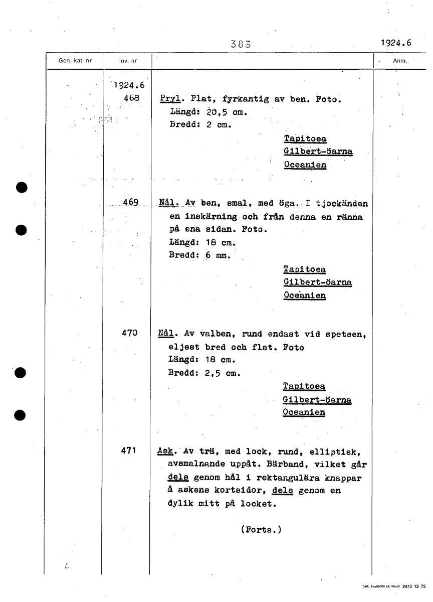 383 1924.6 1924.6 468 Pryl. Flat, fyrkantig av ben. Foto. Längd: X0,5 cm. Bredd: 2 cm. Tapitoea Gilbert-öarna Oceanien 469 Nål 2 Av ben, smal, med öga..1 tjockänden en inskärning och från denna en rän...