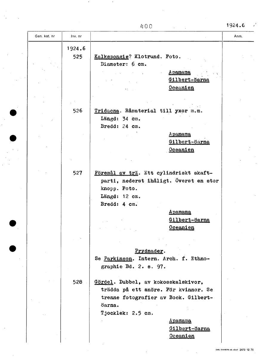 400 1924.6 1924.6 525 äalkepongie? Klotrund. Foto. Diameter: 6 cm. Apamama Gilbert-öarna Oceanien 526 Tridacna. Råmaterial till yxor m.m. Längd: 34 cm. Bredd: 24 cm. Apamama Gilbert -öarna Oceanien 52...Visa hela