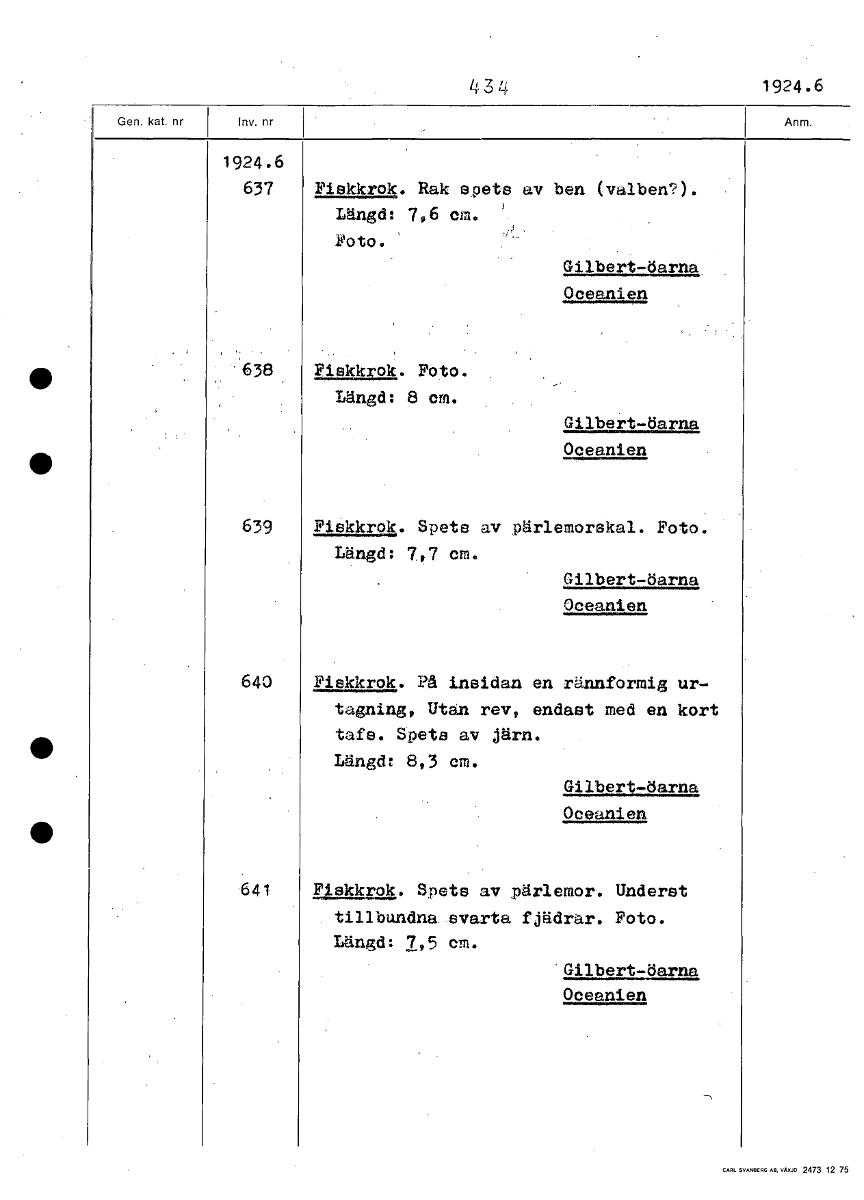434 1924.6 1924.6 637 Fiskkrok. Rak spets av ben (valben?). Längd: 7,6 cm. Foto. Gilbert-öarn Oceanien 638 Fiskkrok. Foto. Längd: 8 cm. Gilbert-öarna Oceanien 639 Fiskkrok. Spets av pärlemorskal. Foto...Visa hela