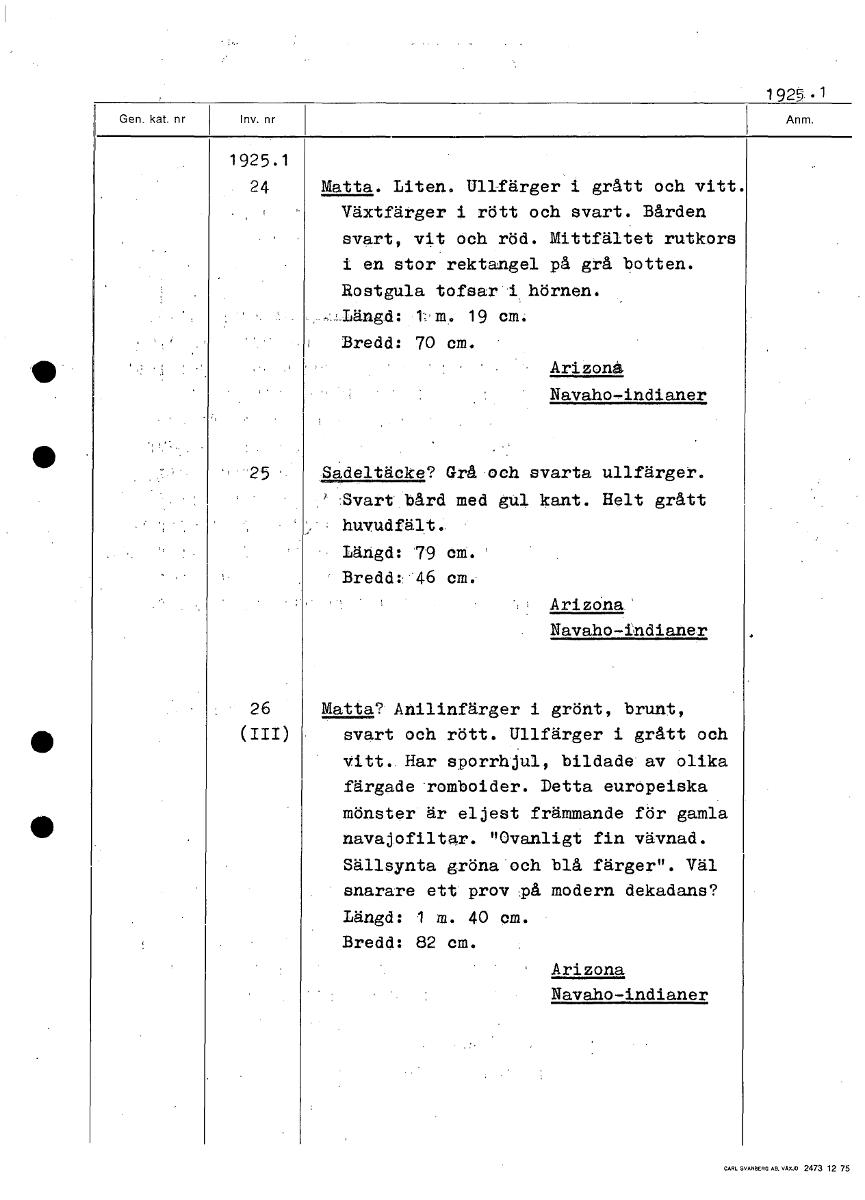 1925 • 1 1925.1 24 Matta. Liten. Ullfärger i grått och vitt. Växtfärger i rött och svart. Bården svart, vit och röd. Mittfältet rutkors i en stor rektangel på grå botten. Rostgula tofsar i hörnen. Längd: t.m. 19 cm. Bredd: 70 cm. Arizona Navaho-indianer 25 Sadeltäcke? Grå och svarta ullfärger. '.Svart bård med gul kant. Helt grått huvudfält. Längd: 79 cm. Bredd: 46 cm. Arizona.' Navaho-indianer Matta? Aftilinfärger i grönt, brunt, svart och rött. Ullfärger i grått och Vitt.. Har sporrhjul, bildade av olika färgade .romboider. Detta europeiska mönster är eljest främmande för gamla navajofiltar. "Ovanligt fin vävnad. Sällsynta gröna'och blå färger". Väl snarare ett prov på modern dekadans? Längd: 1 m. 40 cm. Bredd: 82 cm. Arizona Navaho-indianer [ocr]Stäng