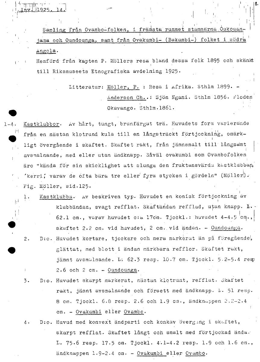 i 'THHU 1 il Itiy,a925. Samling från Ovambo-folken, i fränsta rummet stammarna,Oukouan.- jama och Oundounga, samt från Ovakumbi (Bakumbi-) folket i södrla Angola. Hemförd från kapten P. Millers resa b...