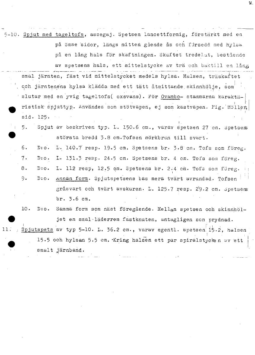 5-10. Spjut med tageltofs, assegaj. Spetsen lancettformig, förstärkt med en på ömse Sidor, längs mitten gående ås och försedd med hylsa på en lång hals för skiftningen. Skaftet tredelat, bestående av ...