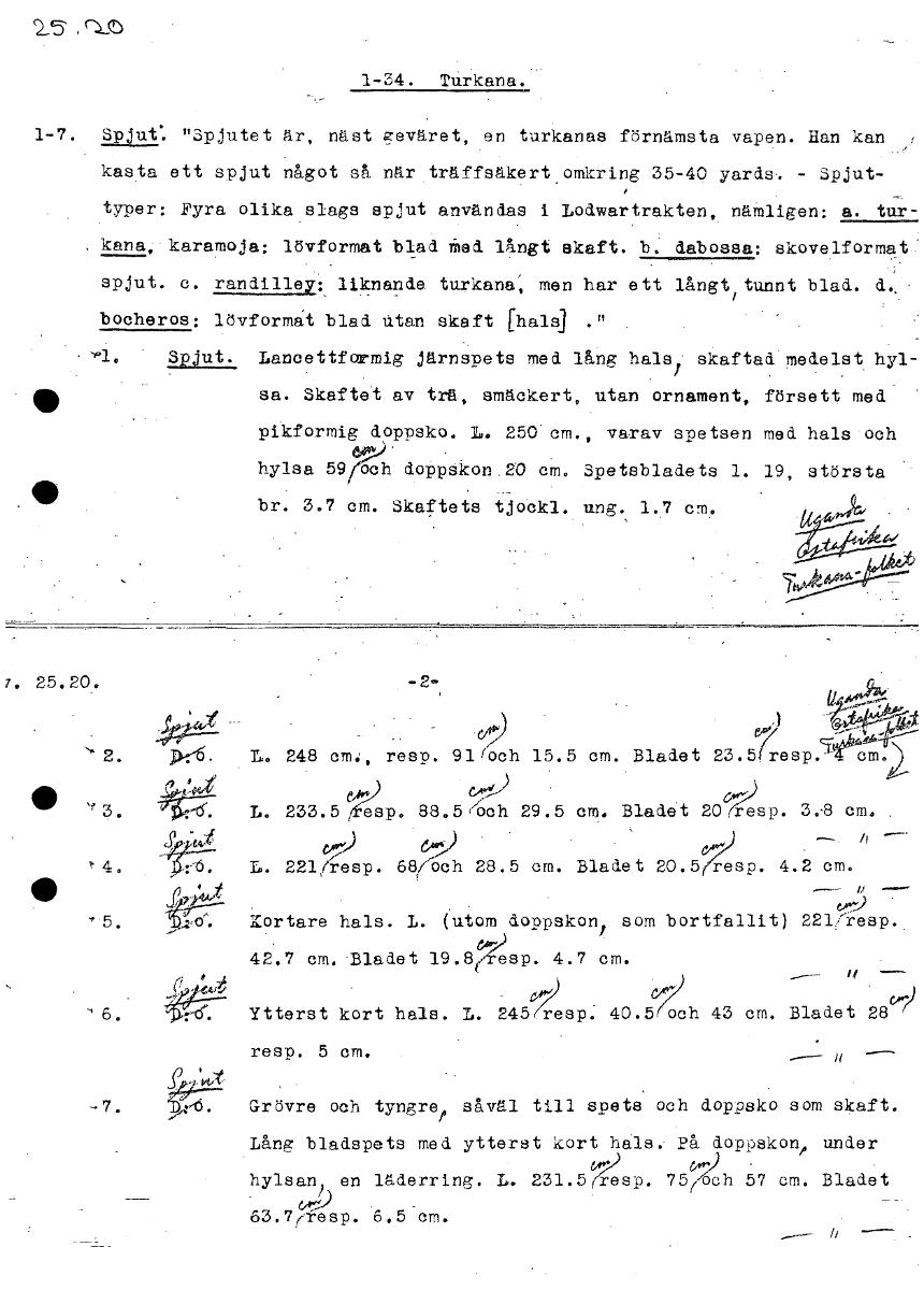 5 1-34. Turkana. 1-7. Spjut. "Spjutet är, näst geväret, en turkanas förnämsta vapen. Han kan kasta ett spjut något så när träffsäkert omkring 35-40 yards. - Spjut- typer: Fyra olika slags spjut använd...