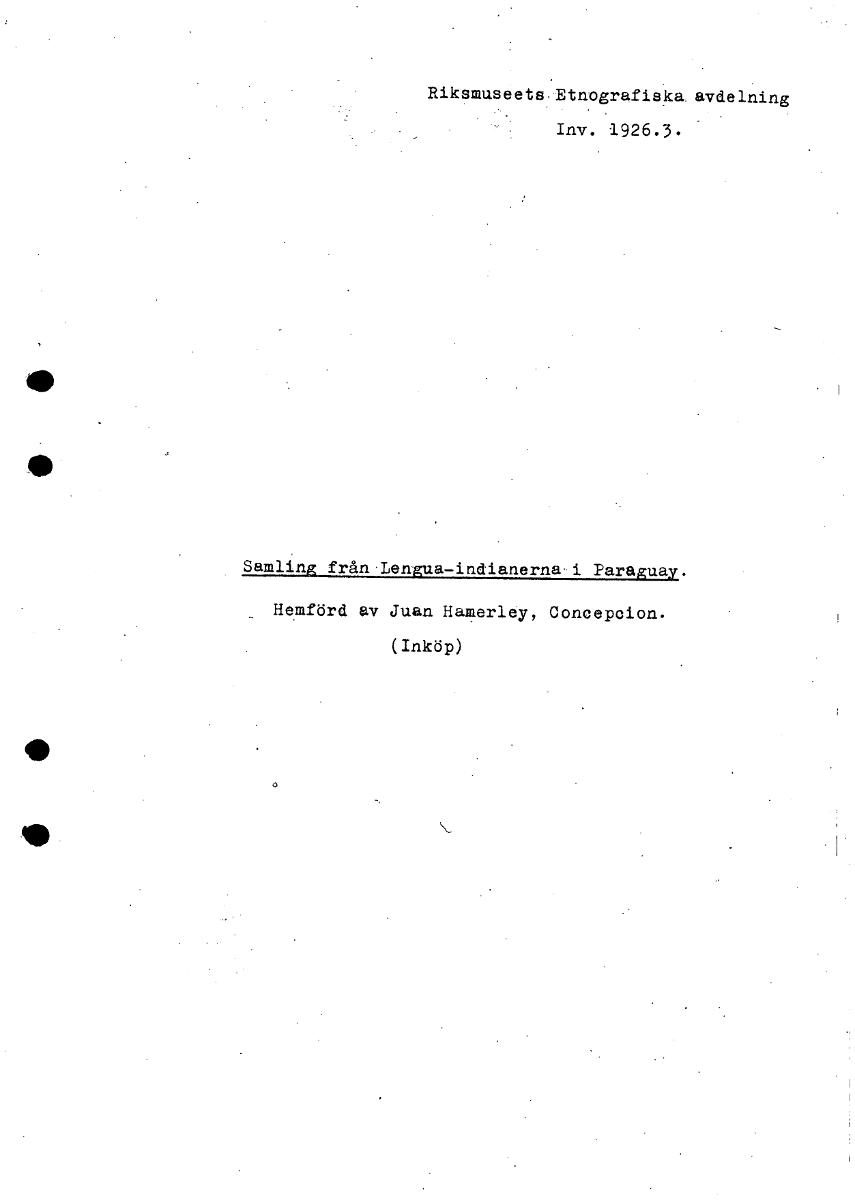 • Riksmuseets Etnografiska avdelning Inv. 1926.3. Samling från Lengua-indianerna•i Paraguay. Hemförd av Juan Hamerley, Concepoion. (Inköp) • [ocr]