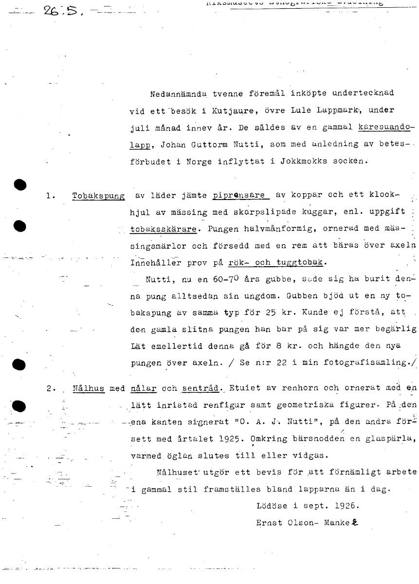Nedannämnda tvenne föremål inköpte undertecknad vid ett-besök i Kutjaure, övre Lule Lappmark., under juli månad innev år. De såldes av en gammal karesuando- lapp, Johan Guttorm Nutti, som med anlednin...