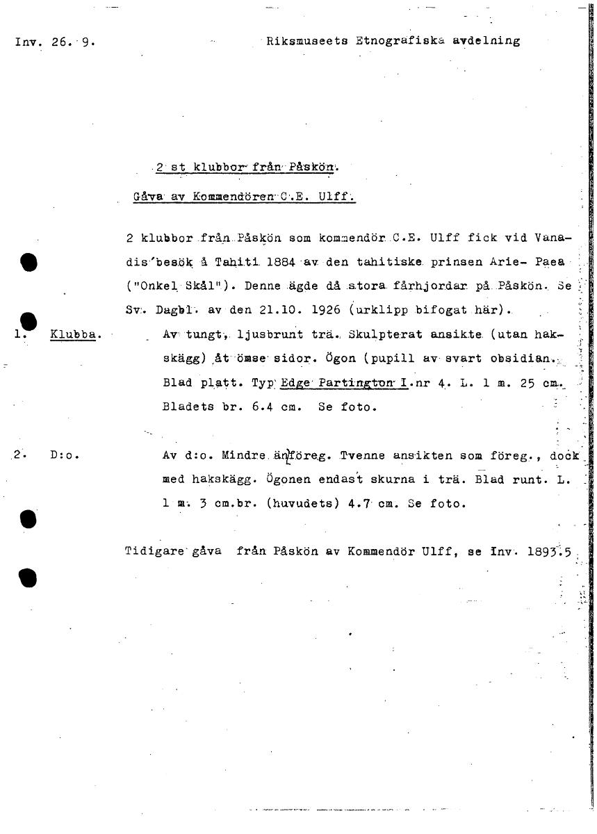 Inv. 26..9. Riksmuseets Etnografiska avdelning .2. st klubbor- från-Påskön'. Gåva av Kommendören. Ulff 2 klublor.från_Påskön som kommendör.C.E. Ulff fick vid Vana- • diw'besök å Tahiti. 1884 av den tah.itiske. prinsen Arie- Paea- ("Onkel•Skål".). Denne ägde då .stora fårhjordar på..Påskön.. Se DagbL av den 21.10. 1926 (urklipp bifogat.här), • 1. Klubba. Av tungt ljusbrunt trä., Skulpterat ansikte. (utan hak- skägg) åt-ömse.sidor. Ögon (pupill av svart obsidian.;.. Blad platt. Typ-Edge.Partington-I.nr 4. L. 1 m. 25 ca._ Bladets br. 6.4 cm. Se foto. D:o. Av d:o. Mindre.ä öreg. Tvenne ansikten som föreg., doåk med hakskägg. Ögonen endast skurna i trä. Blad runt. L. 1 m: 3 cm.br. (huvudets) 4.7 cm. Se foto. Tidigare.gåva från Påskön av Kommendör Ulff, se Inv. 1893:5 • [ocr]Stäng