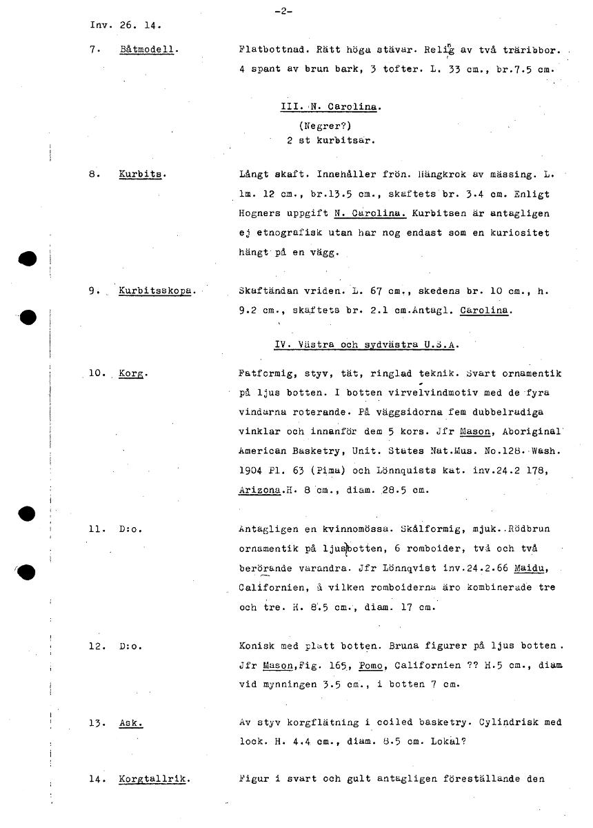 -2- Inv. 26. 14. 7. Båtmodell. Flatbottnad. Rätt höga stävar. Relil av två träribbor. 4 spant av brun bark, 3 tofter. L. 33 cm., br.7.5 cm. III. N. Carolina. (Negrer?) 2 st kurbitsar. 8. Kurbits. Lån...