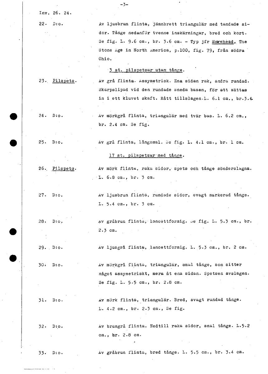 Inv. 26. 24. 22. D:o. Av ljusbrun flinta, jämnbrett triangulär med tandade si- dor. Tånge nedanför tvenne inskärningar, bred och kort. Se fig. L. 9.6 cm., br. 3.6 cm. - Typ jfr Marehead, The Stone Age in North America, p.100, fig. från södra Ohio. 3 st. pilspetsar utan tånge. 23. Pilspets. Av grå flinta. Assymetrisk. Ena sidan rak, andra rundad. Skarpslipad vid den rundade sneda basen, för att sättas in i ett kluvet skaft. Rått tillslagen.L. 6.1 cm.,.br.3.4. 24. D:o. Av mörkgrå flinta, triangulär med tvär bas. L. 6.2 cm., br. 2.4 cm. Se fig. 25. D:o. Av grå flinta, långsmal. Se fig. L. 4.1 cm., br. 1 cm. 17 st. pilspetsar medtånge. 26. Pilspets. Av mörk flinta, raka Sidor, spets och tånge sönderslagna. L. 6.8 cm., br. 27. D:o. Av ljusbrun flinta, rundade sidor, svagt markerad tånge. L. cm., br. 28. D:o. gråbrun flinta, lancettformig. se fig. L. cm., br. 2.3 cm. 29. D:o. Av ljusgrå flinta, lancettformig. L. cm., br. 2 cm. 30. D:o. Av mörkgrå flinta, triangulär, smal tånge, som sitter något assymetriskt, mera åt ena sidan. Spetsen avslagen. Se fig. L. cm., br. 2.8 cm. 31. D:o. Av mörk flinta, triangulär. Bred, svagt rundad tånge. L. 4.2 cm., br. cm., Se fig. 32. D:o.. Av brungrå flinta. Nedtill raka sidor, smal tånge.. L.5.2 cm., hr. 2.8 cm. D:o. Av gråbrun flinta, bred tånge. L. cm., br. 3.4 cm. [ocr]