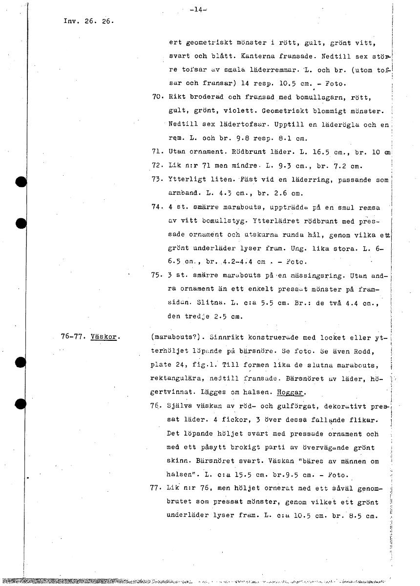 • • -14- Inv. 26. 26. ert geometriskt mönster i rött, gult, grönt vitt, svart och blått. Kanterna fransade. Nedtill sex stör- re tofsar av smala läderremmar. och br. (utom tof- sar och fransar) 14 resp.... Visa hela