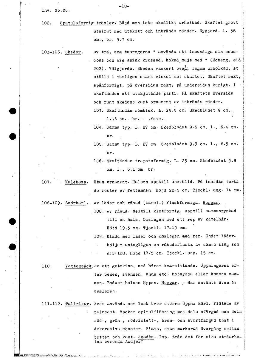 -18- Inv. 26.26. 102. Spatulaformig träslev. Böjd men icke skedlikt urholkad. Skaftet grovt utsirat med utskott och inbrända ränder. Nygjord. L. 38 cm., br. 5.7 cm. 103-106. Skedar, av trä, som tuareg...