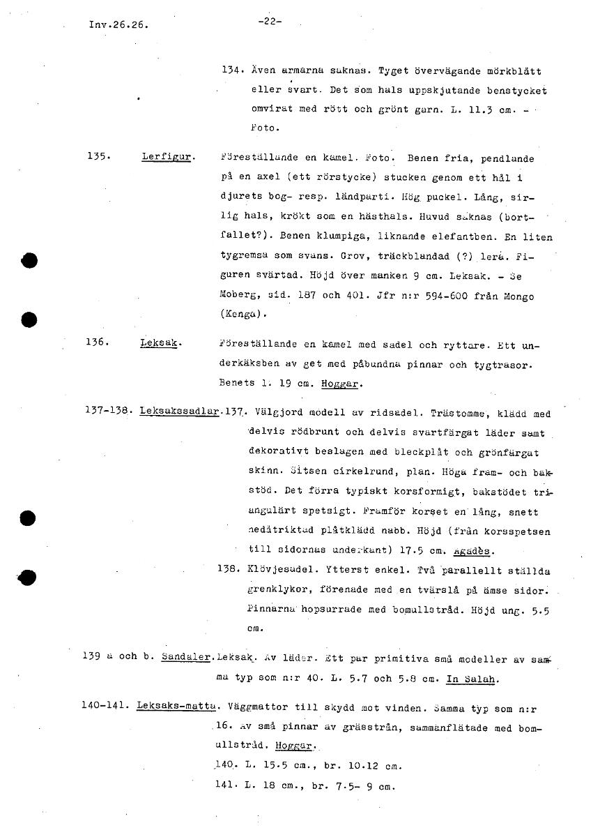 • Inv.26.26. -22- 134. Även armarna saknas. Tyget övervägande mörkblått eller svart. Det som hals uppskjutande benstycket omvirat med rött och grönt garn. L. 11.3 cm. - Foto. 135. Lerfigur. Föreställand... Visa hela