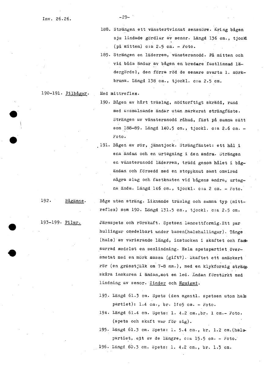 Inv. 26.26. 188. Strängen ett vänstertvinnat sensnöre. Kring bågen sju lindade gördlar av senor. Längd 136 cm., tjockt . (på mitten) c:a 2.5 cm. - Foto. 189. Strängen en läderrem, vänstersnodd. På mitten och vid båda ändar av bågen en bredare'fastlimmad lä- dergördel, den förra röd de senare svarta 1. mörk- bruna. Längd 138 cm., tjockl. c:a 2.5 cm. 190-191. Pilbågar. Med mittreflex. 190. Bågen av hårt träslag, nödtorftigt skrädd, rund med avsmalnande ändar utan markerat strängfäste. Strängen av vänstersnodd råhud, fäst på samma sätt som 188-89. Längd 140.5 cm., tjockl. c:a 2.6 cm. Foto. 191. Bågen av rör, jämntjock. Strängfästet: ett hål i ena ändan och en urtagning i den andra. Strängen en vänstersnodd läderrem, trädd genom hålet i båg- ändan och försedd med en stoppknut samt omvirad några slag och fastknuten vid bågens andra,- urtag- na ända. Längd 146 cm., tjockl. c:a 2 cm. - Foto. 192. Bågämne. Båge utan sträng. Liknande träslag och samma typ (mitt- reflex) som 190. Längd 131.5 cm., tjockl. c:a 2.5 cm. 193-199. Pilar. Järnspets och röråkaft. Spetsen lancettformig.Ett par hullingar omedelbart under basen(halshullingar). Tånge (hals) av varierande längd, instucken i skaftet och fast- surrad medelst en senlindning. Hela spetspartiet över- smetat med en mörk massa (gift?). Skaftet ett smäckert rör (en grässtjälk om 7-8 mm.), med en klykformig strärg skåra inskuren i ändan,mot en led. Ändan förstärkt med lindning av senor. `Linder och Nguigmi. 193. Längd 61.3 cm. Spets (den egentl. spetsen utom hals partiet): 1.4 cm., br. lfo5 cm. - Foto. 194. Längd 61.4 cm. Spets: 1. 4.2 cm.,br. 1 cm.- Foto. (spets och skaft var för sig). 195. Längd 61.3 cm. Spets: 1. 5.4 cm., br. 1.2 partiet, e,tt av de längre, c:a 15.5 cm. - Foto. 196. Längd 60.3 cm. Spets: 1. 4.2 cm., br. 1.3 cm. [ocr]