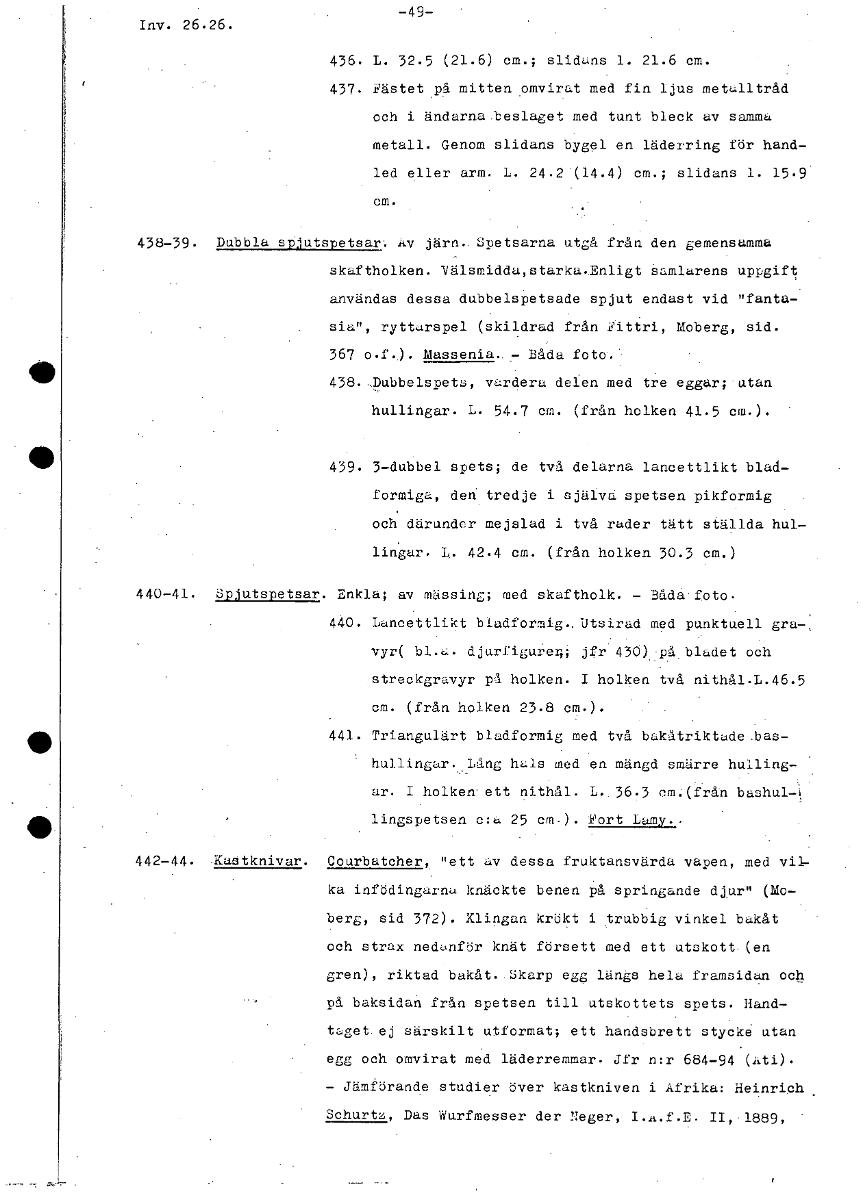 -49- Inv. 26.26. 436. L. 32.5 (21.6) cm.; slidans 1. 21.6 cm. 437. Fästet på mitten omvirat med fin ljus metalltråd och i ändarna.beslaget med tunt bleck av samma metall. Genom slidans bygel en läderr...