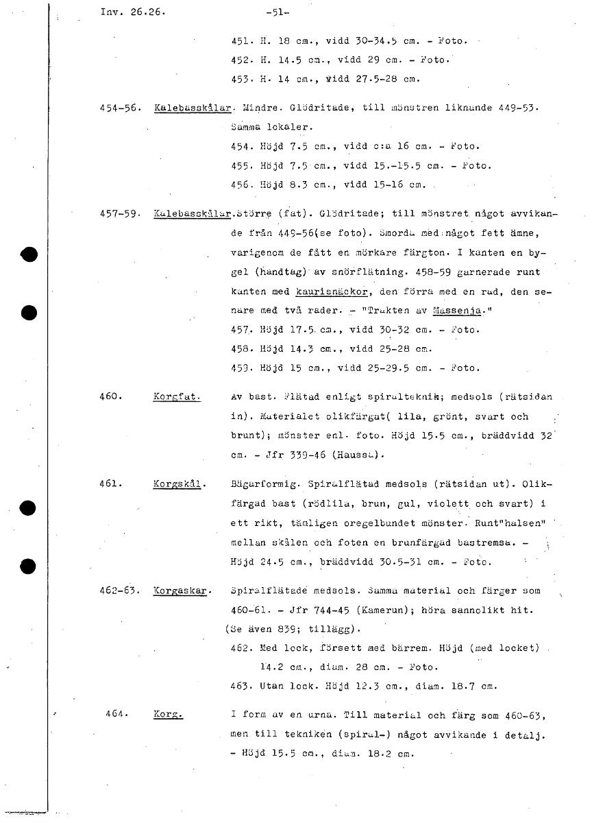 • Inv. 26.26. -51- 451. H. 18 cm., vidd 30-34.5 cm. - Foto. 452. H. 14.5 cm., vidd 29 cm. - Foto. 453. H. 14 cm., tidd 27.5-28 cm. 454-56. Kalebasskålar. Mindre. Glödritade, till mönstren liknande 449-5... Visa hela