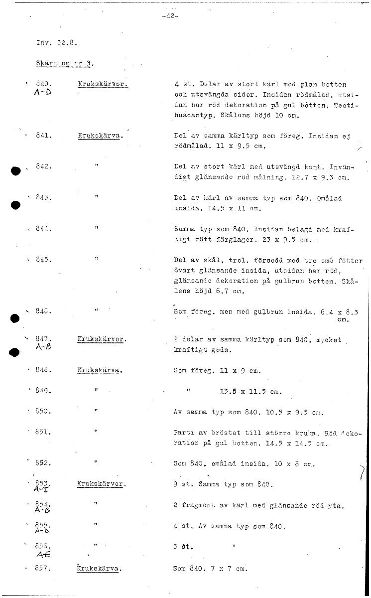 -42- I v. 32.8. Skärninq nr 3. 840. Krukskär or. 4 st. Delar av stort kärl mod plan botten A--4 och utsvängda sidor. Insidan rödmålad, utsi- dan har röd dekoration på gul båtten. Teoti- huacantyp. Skå...