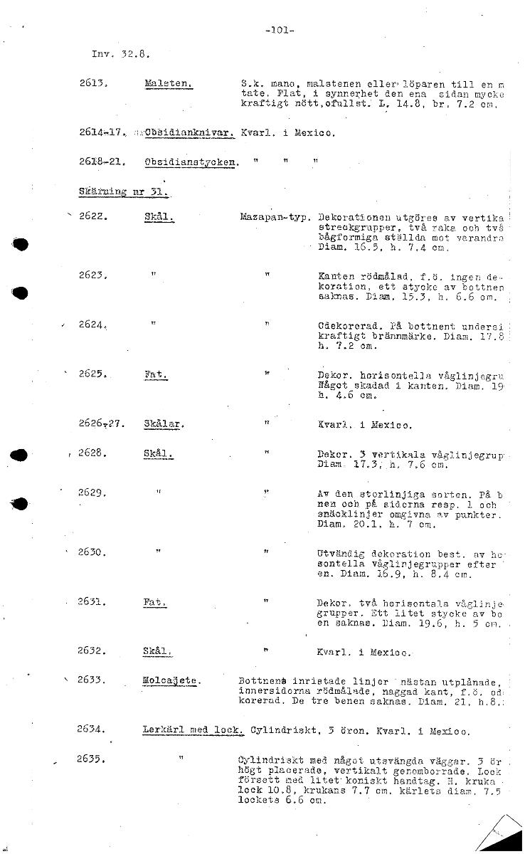 -101- Inv. 32.8. 2613. Malsten. S.k. mano, malstenen eller löparen till en tate. Flat, i synnerhet den ena sidan mycke kraftigt nött,ofullst. L. 14.8, bi-, 7.2 cm, 2614-17, ,Obsidianknivar. Kvarl. i Mexico. 26'8-21. Obsidianstycken. 21.5:1151-152.22LIL 2622. Skål. Mazapan-typ. Dekorationen utgöres av vertika streckgrupper, två raka och två bågformiga ställda mot varandra • • Diam. 16.5, h. 7.4 cm, 2623, Kanten rödmålad, f.ö. ingen de- • koration, ett stycke av bottnen saknas. Diam. 15.3, h, 6.6 cm. 2624. °dekorerad. På bottnent undersi kraftigt brännmärke. Diam, 17.8 Ii, 7.2 cm. 26,3, Fat. Dekor. horisontella våglinjogru Något skadad i kanten. Diam. 19. h. 4.6 cm. 2626727. Skåla Kvart i Mexico. • , 2628. Skål. Dekor. 3 vertikala våglinjegrup Diam. 17.3;.h. 7.6 cm. 2629. Av den storlinjiga sorten. På b nen och på sidorna resp. 1 och snäcklinjer omgivna av punkter. Diam. 20.1, h. 7 cm. 2630. Utvändig dekoration. best. av ho. sontella våglinjegrupper efter en. Diam. 16.9, h. 8.4 cm. 2631. Fat, Dekor, två horisontala våglinje, grupper. Ett litet stycke av bo en saknas. Diam. 19.6, h. 5 cm. • 2632. Skål. fl Kvarl. i Mexico. 2633. Molcaje e, Bottnen å inristade linjer nästan utplånade, innersidorna rödmålade, naggad kant, f.ö. odf korer-d. De tre benen saknas. Diam, 21, h.8.: Lerkärl med lock. Cylindriskt, öron. Kvarl. i Mexico. 2635. Cylindriskt med något utsvängda väggar. 3 ör högt placerade, vertikalt genomborrade. Lock försett med litet koniskt handtag. H. kruka • ock 10.8, krukans 7.7 cm. kärlets diam. 7.5 ookets 6.6 cm. [ocr]