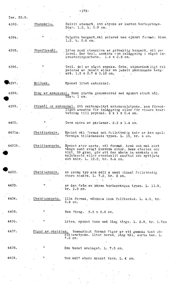 -172- Inv. 32.8. 4393. Stenpärla. Gulvit stenart, ett stycke av kanten bortsprängd. Diam. 1.3, h. 0.9 cm. 4394. Gulgrön bergart,väl polerad men ojämnt formad. Diam, 1.2, h. 0.8 cm. 4395. Stenföremål. ...
