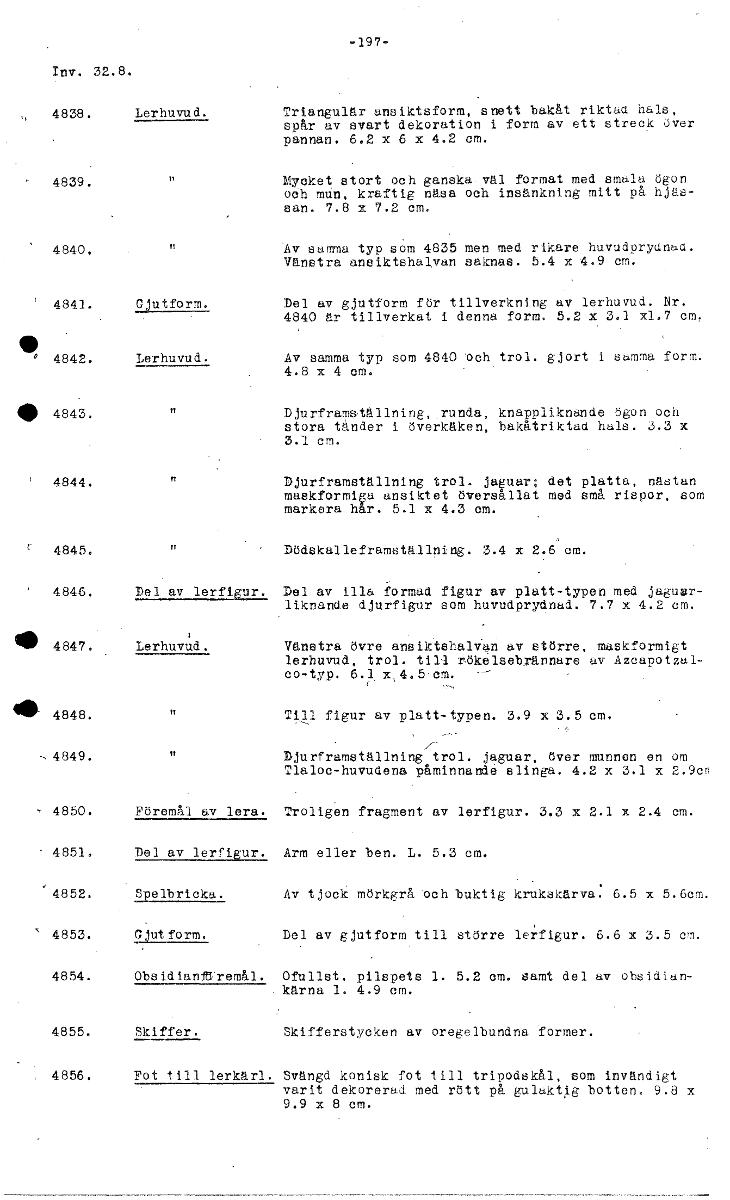 -197- Inv. 32.8. 4838. Lerhuvu d. Triangulär ansiktsform, snett bakåt riktad hals, spår av svart dekoration i form av ett streck över pannan. 6.2 x 6 x 4.2 cm. 4839. Mycket stort och ganska väl format med smala ögon och mun, kraftig näsa och insänkning mitt på hjäs- san. 7.8 x 7.2 cm. 4840, Av sa= typ som 4835 men med rikare huvudprydnad. Vänstra ansiktshalvan saknas. 5.4 x 4.9 cm. 4841. gjutform. Del av gjutform för tillverkning av lerhuvud. Nr. 4840 är tillverkat i denna form. 5.2 x 3.1 x1.7 cm. 4842. Lerhuvud. Av samma typ som 4840 och trol. gjort i summa form. 4.8 x 4 cm. 4843. Djurframställning,runda, knappliknande ögon och stora tänder i överkäken, bakåtriktad hals. 3.3 x • 3.1 cm. ' 4844. ft Djurframställning trol. jaguar; det platta, nästan maskformiga ansiktet översållat med små rispor, som markera hår. 5.1 x 4.3 cm. ( 4845. Dödskalleframställning. 3.4 x 2.6 cm. 4846. Del av lerfigur. Del av illa formad figur av platt-typen med jaguar- liknande djurfigur som huvudprydnad. 7.7 x 4.2 cm. • 4847. Lerhuvud. Vänstra övre ansiktehalvan av större, maskformigt lerhuvud, trol. till rökelsebrännare uv Azcapotzal- co-typ. 6.1 x,4.5 cm. • 4848. tt Till figur av platt-typen. 3.9 x 3.5 cm. 4849. Djurframställning trol. jaguar, över munnen en om Tlaloc-huvudena påminnande slinga. 4.2 x 3.1 x 2.9cn - 4850. Föremål av lera. Troligen fragment av lerfigur. 3.3 x 2.1 x 2.4 cm. 4851. Del av lerrigur. Arm eller ben. L. 5.3 cm. 4852. Spelbricka. Av tjock mörkgrå och buktig krukskärva: 6.5 x 5.6cm. 4853. Gjutform. Del av gjutform till större lerfigur. 6.6 x 3.5 cm. 4854. ObsidianIremål. °fullst. pilspets 1. 5.2 cm. samt del av obsidian- kärna 1. 4.9 cm. 4855. Skiffer. Skifferstycken av oregelbundna former. 4856. Fot till lerkärl. Svängd konisk fot till tripodskål, som invändigt varit dekorerad med rött på gulaktig botten. 9.8 x 9.9 x 8 cm. [ocr]