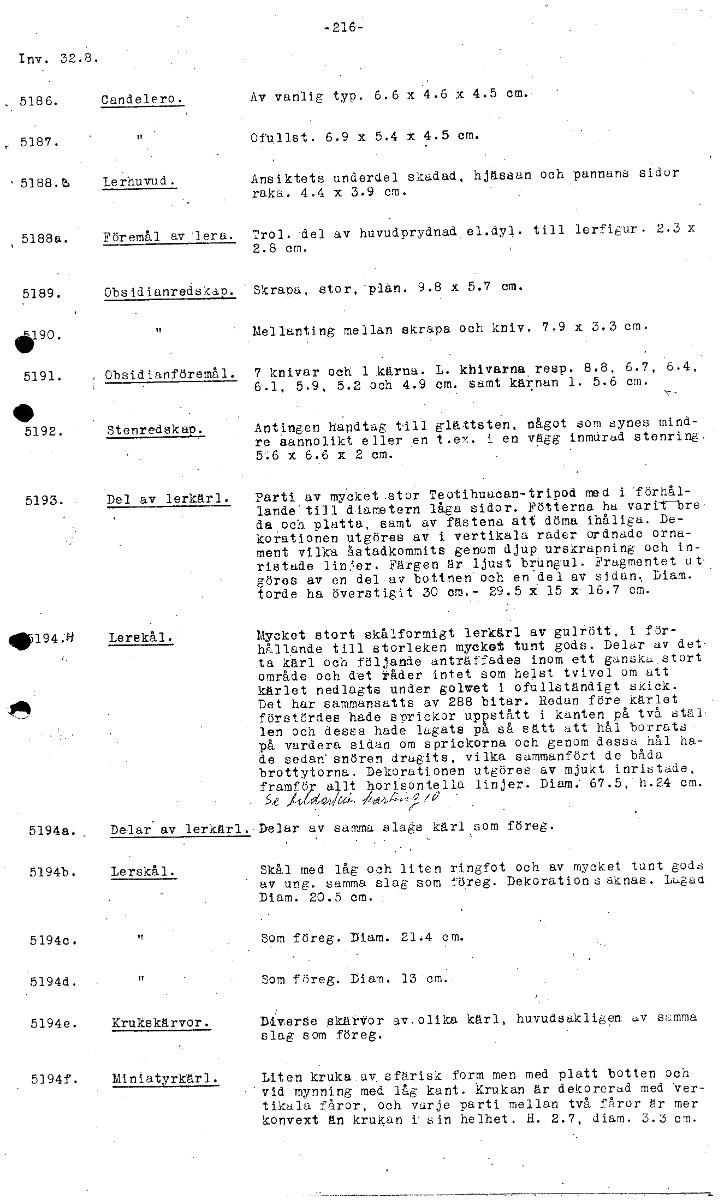 -216- Inv. 32.8. 5186. Candelero. Av vanlig typ. 6.6 x 4.6 x 4.5 cm. 5187. 1Y Ofullst. 6.9 x 5.4 x 4.5 cm. 5188.h Lerhuvud. Ansiktets underdel skadad, hjässan och pannans sidor raka. 4.4 x 3.9 cm. 5188a. Föremål av 'lera. Trol. 'del av huvudprydnad el.dyl. till lerfigur. 2.3 x 2.8 cm. 5189. Obsidianredskap. Skrapa, stor,-plan. 9.8 x 5.7 cm. Mellanting mellan skrapa och kniv. 7.9 x 3.3 cm. 0.90. 5191. , Obsidianföremål. 7 knivar och 1 kärna. L. khivarna resp. 8.8, 6.7, 6.4, 6.1, 5.9, 5.2 och 4.9 cm. samt kärnan 1. 5.6 cm. 01› 5192. Stenredskap. Antingen handtag till glättsten, något som synes mind- re sannolikt eller en t.ex. i en vägg inmurad stenring, 5.6 x 6.6 x 2 cm. 5193. Del av lerkärl. Parti av mycket .stor Teotihuacan-tripod med i förhål- lande'till diametern låga sidor. Fötterna ha vartt-bre da och platta, samt av fästena att döma ihåliga. De- korationen utgöres av i vertikala rader ordnade orna- ment vilka åstadkommits genom djup urskrapning och in- ristade linjer. Färgen är ljust brungul. Fragmentet ut göres av en del av bottnen och endel av sidan. Diam. torde ha överstigit 30 cm.- 29.5 x 15 x 16.7 cm. •194.ki Lerskål. Mycket stort skålformigt'lerkärl av gulrött, i för- hållande till storleken mycket tunt gods. Delar av det• ta. kärl och följande anträffades inom ett ganska.stort område och det råder intet som helst tvivel om att kärlet nedlagts under golvet i ofullständigt skick. Det har sammansatts av 288 bitar. Redan före kärlet förstördes hade sprickor uppstått i kanten på två stäl• len och dessa hade lagats pa så sätt att hål borrats på vardera sidan om sprickorna och genom dessa hål ha- de.sedan'snören dragits, vilka sammanfört de båda brottytorna. Dekorationen utgöres av mjukt inristade, framför allt horisontella linjer. Diam: 67.5, h.24 cm. Atdo40'-. 41•1,47/1 5194a.. Delar av lerkärl..Delar av samma slags kärl som föreg. 5194b. Lerskål. Skål med låg och liten ringfot och av mycket tunt gods av ung. samma slag som föreg. Dekorations aknas. Lagad Diam. 20.5 cm. 5194c. Som föreg. Diam. 21.4 cm. 5194d. Som föreg. Diam. 13 cm. 5194e. Krukskärvor. Diverse skärvor av.olika kärl, huvudsakligen' -v samma slag som föreg. 5194f. Miniatyrkärl. Liten kruka av sfärisk form men med platt botten och vid mynning med låg kant. krukan är dekorerad med Ver- tikala fåror, och varje parti mellan två fåror är mer konvext än krukan i sin helhet. H. 2.7, diam. 3.3 cm. [ocr]