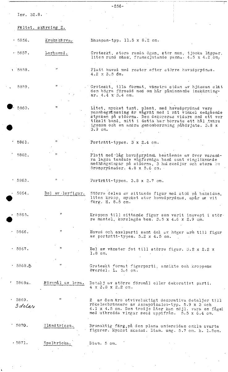 -256- Inv. 32.8. Fältet, skärning 2. • 5856. Kruksh. Mazapnl-typ. 11.5 x 8.2 cm. -5857. Lerhuvud. Groteskt, stora runda ögon, stor mun, tjocka läppar, liten rund näsa', framskjutande pannJ.. 4.5 x 4.2...