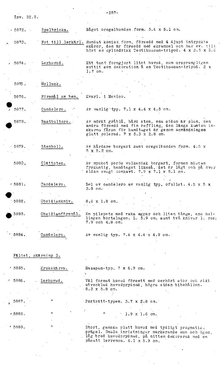 -257- Inv. 32.8. f 5872. Spelbricka. Något oregelbunden. form. 5.4 x 5.1 cm. 5873. Fot till,lerkärl. Rundat konisk. form, försedd med 4 djupt intryckta skåror, .den är försedd med skrammel och har ev. till hört en cylindrisk Teotihuacan-tripod. 4 x 3.5 x 3.6 5874. Lerhuvud. Ett tunt formgjort litet huvud, som ursprungligen suttit som dekoration å en Teotihuacan-tripod. 2 x 1.7 cm.' 5875 . Mollusk. 5876. Föremål av ben,. Kvarl. i Mexico. 5877. Candelero. Av vanlig-typ. 7.1 x 4.4 x 4.5 cm. 5878. . Bastbultare. : Av mörkt gråblå, hård sten, ena sidan är plan, den . qMP andrå försedd med fin reffling, den längs kanten in- skurna fårgn för handtaget är genom användningen glatt polerad. 7 x 5.3 x 2.8 cm. 5879. Stenboll. Av hårdare bergart samt oregelbunden form. 4.5 x 5 x 5.2 cm. 5880. Glättsten. Av mycket porös vulkanisk, bergart, formen nästan fyrkantig, handtaget likaså, det är lågt och på över ' sidan svagt konkavt. 7.9 x 7.1 x 5.1 cm. 5881. Candelero. Del av candelero av vanlig typ, ofullst. 4.5 x 5 x 3.8 • 5882. Obsidiankniv. 8.6 x 1.8 cm. 5883. Obsidianföremål, En pilspets med raka eggar och liten tånge, ena hul- lingen bortslagen.. L. 5.9 cm. samt två knivar 1. res! 7.9 och 4.8.cm. 5884.. Candelero. Av vanlig typ. 7.4 x 4.4'x 4.9 cm.' Fältet, skärning 3. • 5885. Krukskärva. Mazapan-typ. 7 x 6.9 cm. 5886. Lerhuvud. Väl format huvud försett med oerhört stor och rikt utvecklad huvudprydnad, högra sidan bibehållen. 8.3 x 5.8 cm. 5887. Porträtt-typen. 3.7 x 2.8 cm. 5888. 1.9 x 1.6 cm. • 5889. Stort, ganska platt huvud med tydligt prognatis,:. prägel. Smala inristningar markerande mun och ögon, låg bred huvudprydnad, på mitten dekorerad med en påsatt lerremsa. 6.1 x 5.9 cm. [ocr]